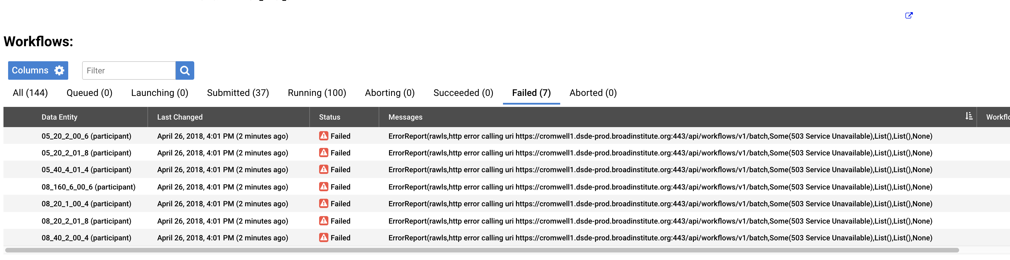 I ran a workflow of 100 jobs and 7 just didn't start. I will re-start them but this is a new issue because I used to be able to run 1000+ jobs without issue.
