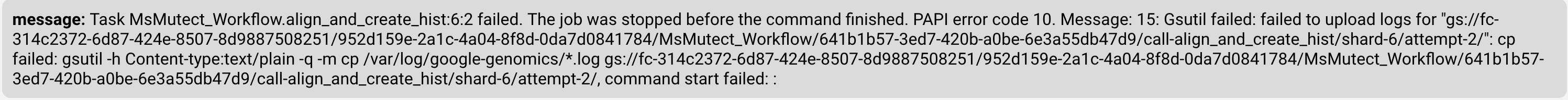 Task MsMutect_Workflow.align_and_create_hist:3:1 failed. The job was stopped before the command finished. PAPI error code 10. Message: 15: Gsutil failed: failed to upload logs for "gs://fc-314c2372-6d87-424e-8507-8d9887508251/952d159e-2a1c-4a04-8f8d-0da7d0841784/MsMutect_Workflow/641b1b57-3ed7-420b-a0be-6e3a55db47d9/call-align_and_create_hist/shard-3/": cp failed: gsutil -h Content-type:text/plain -q -m cp /var/log/google-genomics/*.log gs://fc-314c2372-6d87-424e-8507-8d9887508251/952d159e-2a1c-4a04-8f8d-0da7d0841784/MsMutect_Workflow/641b1b57-3ed7-420b-a0be-6e3a55db47d9/call-align_and_create_hist/shard-3/, command start failed: